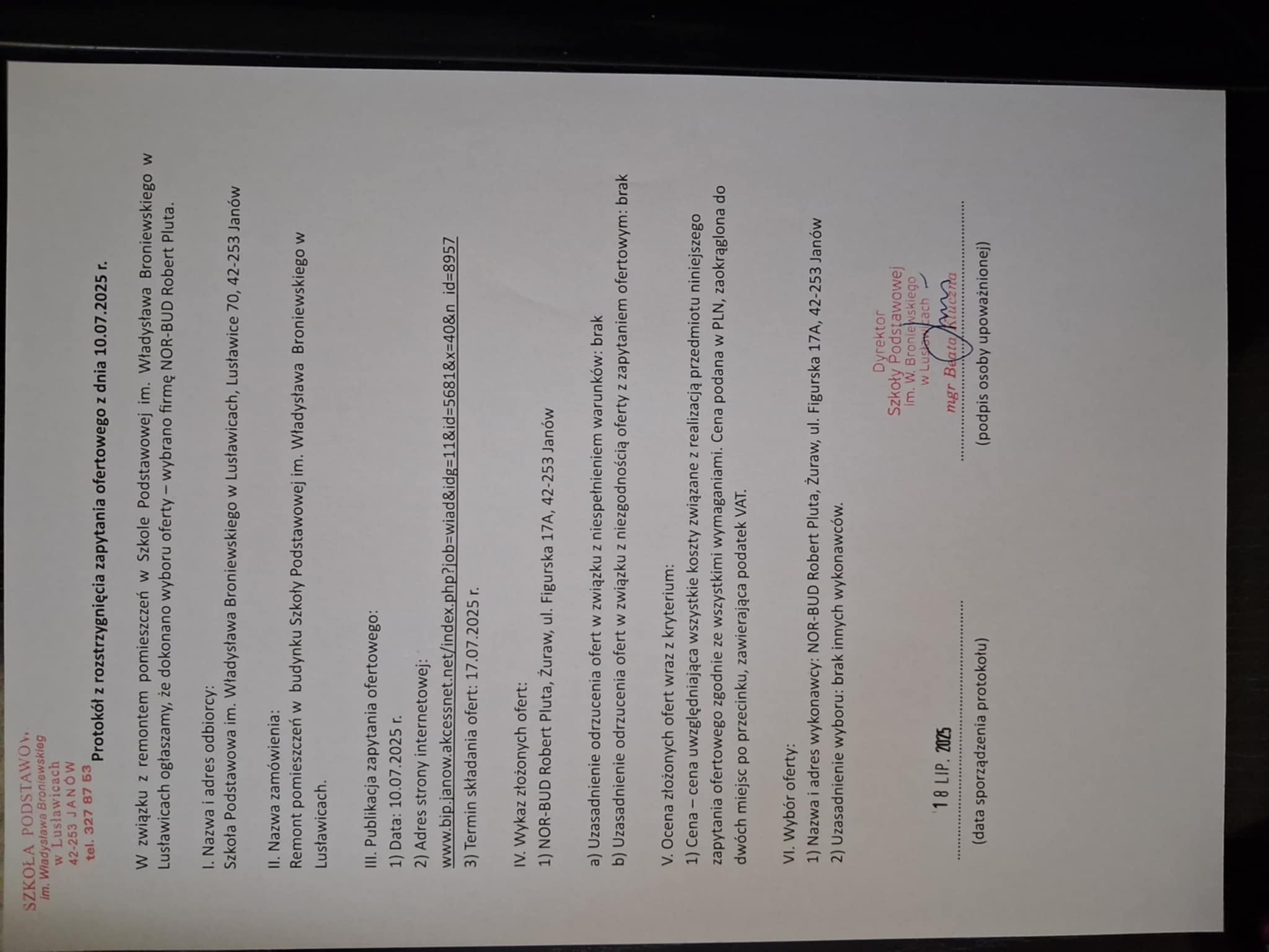 Informujemy, że zapytanie ofertowe z dnia 10.07.2025 r. zostało rozstrzygnięte. Dokonano wyboru wykonawcy - NOR-BUD Robert Pluta.